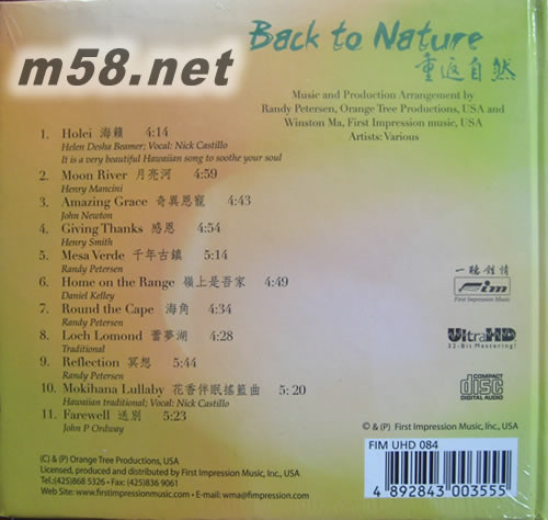 BACK TO NATURE 重返自然 ULTRAHD(m58.net) 一個懶洋洋的下午,我為一張唱片寫了數頁摘記感到疲倦。我一下子沉思地坐在花園走廊的一張藤制的躺椅,在和煦的陽光下閉目養神。 不久,我察覺到我的靈魂在颯颯作響的微風里被眾鳥的歌聲、嗡嗡的蜜蜂聲、瀑布的閃光和搖曳的柳樹環繞。舒適的音律與和風平復了我紛擾的思維。我斜躺在大自然的搖籃里,無疑是我的疲乏的靈魂需要一劑滋補品。 平和的思引發我的一個構思,我要改編一些美妙的音樂與大自然的音聲配合,給我自己帶來欣悅和一份禮物。 三個月后,我出版了《萬籟之聲》。 我出版這張唱片的初衷原是為己,而不是為市場展銷。事實上這張CD出售最初的六個月吸引不到觀眾,之后她漸漸備受歡迎,并且聽眾與日俱增。幸知音的口碑,現今《萬籟之聲》是我們目錄中最暢銷的一種。聽眾要求更多類似的音樂。 我相信類似《萬籟之聲》的音樂應該是輕快;賦有品味的優美編曲;管弦部分則要簡潔,而音色醇厚。自然的音聲不應人為制造,而是真正的自然交響樂與音樂融合成一體。這是一件不容易做到的事。我花了五年時間創造了《重返自然》。《萬籟之聲》的音質雖然已經被公認極佳,但我深信這張新的唱片的音質比《萬籟之聲》更勝一籌。 這里,我希望能超過你們的期望,我特邀樂友編寫流行在太平洋邊緣及全國的一首詩意盎然的曲調,放在曲目之最尾,為你多奏一曲。請您聽聽這首是哪曲? 我懇切希望你們喜愛這張唱片,讓它在這個紛擾的時間帶給你寧靜,并且你們能與我分享你們的經驗。 馬濬 2012年1月于西雅圖