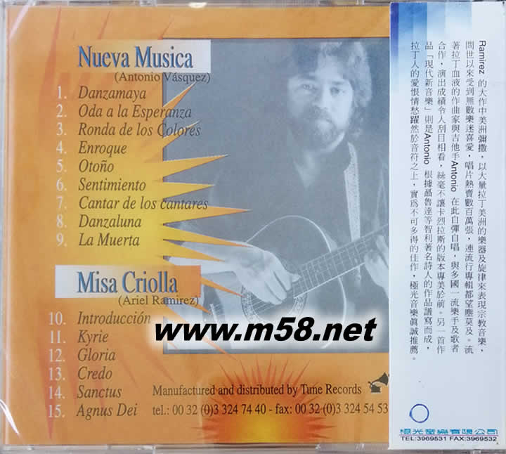 中南美彌撒 Antonio Vasquez Misa Criolla(m58.net) Ramirez 的大作中美洲彌撒,以大量拉丁美洲的樂器及旋律來表現宗教音樂,問世以來受到無數樂迷喜愛,唱片熱賣數百萬張,連流行專輯都望塵莫及。流著拉丁血液的作曲家與吉他手Antonio Vasquez在此自彈自唱,與多國一流樂手及歌者合作,演出成績令人刮目相看,絲毫不讓卡烈拉斯的版本專美於前。另一首作品「現代新音樂」則是Antonio根據聶魯達等智利著名詩人的作品譜寫而成,拉丁人的愛恨情愁躍然於音符之上,實為不可多得的佳作,極光音樂真誠推薦。
