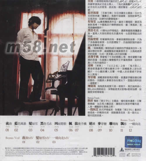 十一月的蕭邦 浪漫古典因子譜出音樂新詩篇 隨專輯附贈[周杰倫2006年浪漫詩篇桌歷]&[3首唯美雋永MV]VCD 1 夜曲 2 藍色風暴 3 發如雪 4 黑色毛衣 5 四面楚歌 6 楓 7 浪漫手機 8 逆鱗 9 麥芽糖 10 珊瑚海 11 飄移 12 一路向北 Bonus VCD 1.夜曲 (Music Video) 2. 發如雪 (Music Video) 3.一路向北 (Music Video) 夜曲 小調情歌與周式饒舌的完美結合,悲愴吉他+古典鋼琴凄美紀念逝去戀人,(為你彈奏蕭邦的夜曲,紀念我死去的愛情,跟夜風一樣的聲音,心碎的很好聽..) 藍色風暴 (百事可樂)全亞洲廣告主題曲。仿巴洛克時期神劇(彌賽亞)氣勢吟唱鋪陳,強勁節奏卷起狂風浩劫,訓練你的聽覺極速! 發如雪 JAY最推薦絕美作品。蘊含三種唱腔,飆音再創新高峰!中國風流行樂開創始祖,繼(東風破)后再登巔峰靚作! 黑色毛衣 小調R&B抒情極品,濃厚異國風情瀰漫全曲。當兩人共穿的黑色毛衣遺失時,也是愛情逝去的時候... 四面楚歌 咬著蘋果的狗,拿著長鏡頭說故事,只為了多換幾根骨頭,在四面環敵下,杰化諜對諜所創作的保育動物之歌。 楓 (南拳媽媽)彈頭為師兄填詞的抒情搖滾佳作。充滿回憶的秋季,緩緩飄落的楓葉像思念,北風略過想你的容顏,化成一頁頁動人的沉寂詩篇...... 浪漫手機 帶著喝下午茶的輕松心情,微笑瀏覽手機里的浪漫,在虛擬土壤慢慢用文字灌溉情感,給你的真心只有杰倫限定。 逆鱗 [將軍],[以父之名]之后,[鬼才詞人]黃俊郎貢獻周式嘻哈最新力作!誤觸龍身上逆生的鱗片,小心龍的傳人反擊,中國人的自尊絕不許被外人欺侮! 麥芽糖 滿載清新香氣的情歌,香濃麥芽糖就像初戀的顏色,田園詩人拿著吉他在陽光下,甜蜜的與你談一場戀愛! 珊瑚海 海鳥跟魚相愛只是一場意外,周杰倫與粱心頤(LARA)清新組合,深情創造男女對唱K歌新指標,就讓愛深埋珊瑚海...... Bonus Track: 飄移 電影[頭文字D]主題曲,嘻哈氣味濃厚。引擎像樂器,加足馬力飆到底,讓叛逆在兩旁呼嘯而過,人車一體飄移在青春之間! 一路向北 英式抒情搖滾,為電影[頭文字D]量身訂做插曲。你轉身向背,側臉還是很美,我一路向北,朝向孤寂前進。