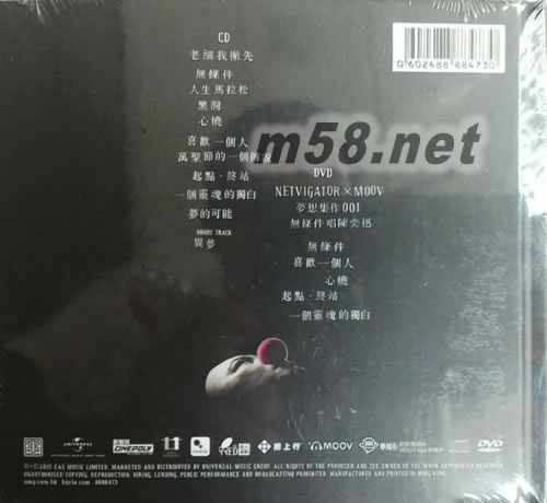 CD1.老細(xì)我撇先 2.無(wú)條件 3.人生馬拉松 4.黑洞 5.心燒 6.喜歡一個(gè)人 7.萬(wàn)圣節(jié)的一個(gè)傳說(shuō) 8.起點(diǎn)‧終站 9.一個(gè)靈魂的獨(dú)白 10.夢(mèng)的可能Bonus Track 11.異夢(mèng)CD1.老細(xì)我撇先 2.無(wú)條件 3.人生馬拉松 4.黑洞 5.心燒 6.喜歡一個(gè)人 7.萬(wàn)圣節(jié)的一個(gè)傳說(shuō) 8.起點(diǎn)‧終站 9.一個(gè)靈魂的獨(dú)白 10.夢(mèng)的可能Bonus Track 11. 異夢(mèng)Netvigator x MOOV夢(mèng)想集作001無(wú)條件唱陳奕迅 DVD 1.無(wú)條件 2.喜歡一個(gè)人 3.心燒 4.起點(diǎn)‧終站 5.一個(gè)靈魂的獨(dú)白