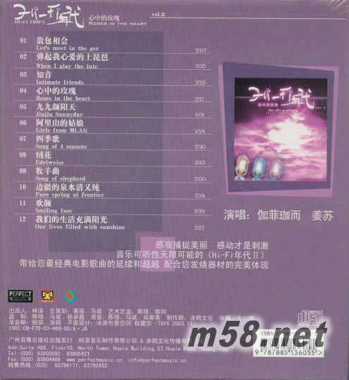 HI-FI年代VOL.2心中的玫瑰(m58.net) 請點看產品大圖及內頁歌詞及歌手靚相 伽菲珈而、姜蘇,兩個新鮮而美麗的名字,假如你的耳朵偶然與她們的歌聲相遇,會立即停住匆匆的腳步,去細聽那《知音》《我們的生活充滿陽光》全是老電影主題曲……穿越了時空,被這樣清亮甜潤的聲音詮釋出來,會在瞬間打動你的心靈。 這張碟人聲的表達相當細膩,配器及錄音也很專業,一首歌用不同的節拍唱出來,慢拍時悠揚而深情,快拍時激昂澎湃,加上樂器的凌厲配合,使得歌曲的感染力達到一種全新境界。 伽菲珈而與姜蘇的聲音細聽起來各有不同,伽菲珈而的聲音聽上去更飄逸,姜蘇的聲音聽上去更清亮。 因著這些新鮮而美麗的聲音你會更加深深愛上中國的民歌。 HI-FI年代發燒系列有: HI-FI年代VOL.1懷念戰友 HI-FI年代VOL.2心中的玫瑰 HI-FI年代VOL.3烏蘇里船歌 HI-FI年代VOL.4沂蒙山小調 主唱:姜蘇,伽菲伽而