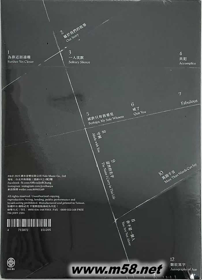 1. 為靠近而遠離. Further Yet Closer 2. 屬于我們的故事. Story of Us 3. ㄧ人沉默. Silence for One 4. 共犯. Accomplice 5. 或許只有我看見. Maybe It's Just Me 6. 戒了. Quit 7. Fabulous. 8. 守候. Await 9. 這世的名字. Name of This Life 10. 萬語千言. Ten Thousand Words 11. 你不是ㄧ個人. You Are Not Alone 12. 皺紋寫字. Wrinkles Write