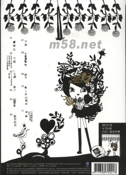 夢里花(臺灣版)(m58.net) 隨CD附送:20072007韶光年歷 夢是自己的內(nèi)在城堡 夢里是一個(gè)花與旋律的世界 一場聽覺與視覺的夢里花 關(guān)于成長蛻變與勇敢做夢的張韶涵 2007 全新專輯 夢里花 Flower in the wonderland 全面盛開