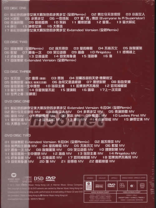 CD 1 01. 粉紅色的神奇女俠大戰灰色的非男非女 02. 男仕今天你很好 03. 小心女人 04. X派對 05. 非男非女 06. 一夜成名 07. 星秀傳說 08. 表演時間 09. 發熱發亮 10. 煞科 11. 獨家試唱 12. 愛是 13. 螢光粉紅 14. 神化 15. 神奇女俠 16. 大暴走 17. 粉紅色的神奇女俠大戰灰色的非男非女 Extended Version CD 2 01. 回味無窮 02. 舍不得你 03. 愛的挽歌 04. 不拖不欠 05. 唉聲嘆氣 06. 默契 07. 最後一次 08. 哭泣游戲 09. 插曲 10. Arigatou 11. 感情線上 12. 終身美麗 13. 交換溫柔 14. 回來我身邊 15. 落錯車 16. 傷 17. 回味無窮 Ex Version CD 3 01. 放不低 02. 值得 (國語) 03. 問我 04. 加爾各答的天使-德蘭修女 05. 談情說愛(Sally Yeh合唱) 06. 為何又是這樣錯 07. 理想對象 08. 心血來潮 09. 愛您是我一生中理想 10. 宿命主義 11. 如果我們不再見 12. 如何掉眼淚 13. 醫生與我 14. 你愛我愛不起 15. 玻璃鞋 16. 跳傘 17. 上一次流淚 18. 世界之最 [你愿意] DVD 1 fast _ Music Video 01. 粉紅色的神奇女俠大戰灰色的非男非女 (Ex Version) Karaoke 02.男仕今天你很好 MV 03. 小心女人 MV 04. 非男非女 MV 05. 表演時間 MV 06. 寵物 MV 07. 發熱發亮 MV 08. 煞科 MV 09. 愛是… MV 10. Ladies First MV 11. 獨家試唱 MV 12. 螢光粉紅 MV 13. 神化 MV 14. 心肝命椗 MV 15. 神奇女俠 MV 16. 大暴走 MV DVD 2 slow _ Music Video 01. 回味無窮 (Ex Version) Karaoke 02. 舍不得你 MV 03. 我們的主題曲 MV 04. 愛的挽歌 MV 05. 不拖不欠 MV 06. 默契 MV 07. 最後一次 MV 08. 唉聲嘆氣 MV 09. 哭泣游戲 MV 10. 理想對象 MV 11. 愛您是我一生中理想 MV 12. 插曲 MV 13. 宿命主義 MV 14. Arigatou MV 15. 終身美麗 MV 16. 交換溫柔 MV 17. 如何掉眼淚 MV 18. 如果我們不再見 MV 19. 回來我身邊 MV 20. 傷 MV 21. 多得他 MV 22. 喜歡戀愛 MV