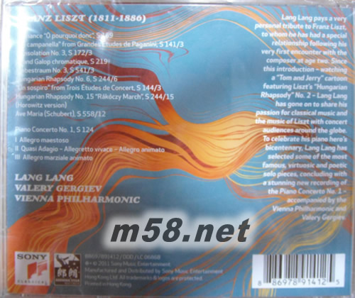 DISC 1 1. 李斯特:E小調(diào) 浪漫曲 —“噢,為什么”,作品169號 2. 李斯特:升G小調(diào) 帕格尼尼練習(xí)曲第3號“鐘”,作品141號 3. 李斯特:降D大調(diào) 第三號安慰曲,作品172 4. 李斯特:降E大調(diào) 華麗半音階嘉洛舞曲,作品219 5. 李斯特:降A(chǔ)大調(diào) 愛之夢第三首,作品541 6. 李斯特:降D大調(diào) 第六號匈牙利狂想曲,作品244號 7. 李斯特:三首音樂會練習(xí)曲,第3首:降D大調(diào) 嘆息,作品144號 8. 李斯特:A小調(diào) 第十五號匈牙利狂想曲/拉柯西進(jìn)行曲(霍洛維茲版本),作品244號 9. 李斯特/ 舒伯特:圣母頌,作品558號 10. 李斯特/ 華格納:伊索德的愛之死【Bonus Track】 11. 李斯特:降E大調(diào) 第一號鋼琴協(xié)奏曲,作品124 第一樂章:莊嚴(yán)的快板 12. 李斯特:降E大調(diào) 第一號鋼琴協(xié)奏曲,作品124 第二樂章:近乎慢板—活潑的小快板—生氣蓬勃的快板 13. 李斯特:降E大調(diào) 第一號鋼琴協(xié)奏曲,作品124 第三樂章:進(jìn)行曲風(fēng)格的快板 DISC 2 1. 《郎朗生命里的一天》(Day in Lang Lang’s Life)(Bonus DVD)