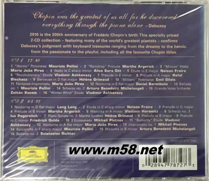 1. POLONAISE NO.6 IN A FLAT MAJOR, OP.53 "HEROIC" Composer:CHOPIN, FREDERIC/CHOPIN 2. 24 PRELUDES, OP.28: NO.15 IN D FLAT MAJOR "RAINDROP" Composer:CHOPIN, FREDERIC/CHOPIN 3. WALTZ NO.6 IN D FLAT MAJOR, OP.64 NO.1 "MINUTE": MOLTO VIVACE Composer:CHOPIN, FREDERIC/CHOPIN 4. WALTZ NO.7 IN C SHARP MINOR, OP.64 NO.2 Composer:CHOPIN, FREDERIC/CHOPIN Performer:OTT, ALICE SARA 5. 12 ETUDES, OP.10: NO.3 IN E MAJOR Composer:CHOPIN, FREDERIC/CHOPIN Performer:FREIRE, NELSON 6. 12 ETUDES, OP.10: NO.12 IN C MINOR "REVOLUTIONARY" Composer:CHOPIN, FREDERIC/CHOPIN Performer:ASHKENAZY, VLADIMIR 7. 24 PRELUDES, OP.28: NO.4 IN E MINOR Composer:CHOPIN, FREDERIC/CHOPIN Performer:BLECHACZ, RAFAL 8. 24 PRELUDES, OP.28: NO.7 IN A MAJOR Composer:CHOPIN, FREDERIC/CHOPIN Performer:BLECHACZ, RAFAL 9. BERCEUSE IN D FLAT MAJOR, OP.57: ANDANTE Composer:CHOPIN, FREDERIC/CHOPIN Performer:GRIMAUD, HELENE 10. POLONAISE NO.3 IN A MAJOR, OP.40 NO.1 "MILITARY": ALLEGRO CON BRIO Composer:CHOPIN, FREDERIC/CHOPIN Performer:GILELS, EMIL/吉利爾斯 11. IMPROMPTU NO.4 IN C SHARP MINOR, OP.66 "FANTAISIE-IMPROMPTU" Composer:CHOPIN, FREDERIC/CHOPIN 12. NOCTURNE NO.2 IN E FLAT MAJOR, OP.9 NO.2 Composer:CHOPIN, FREDERIC/CHOPIN Performer:BARENBOIM, DANIEL 13. BALLADE NO.1 IN G MINOR, OP.23 Composer:CHOPIN, FREDERIC/CHOPIN 14. SCHERZO NO.2 IN B FLAT MINOR, OP.31: PRESTO - SOSTENUTO Composer:CHOPIN, FREDERIC/CHOPIN Performer:MICHELANGELI, ARTURO BENEDETTI 15. WALTZ NO.1 IN E FLAT MAJOR, OP.18 "GRANDE VALSE BRILLANTE" Composer:CHOPIN, FREDERIC/CHOPIN Performer:KOCSIS, ZOLTAN 16. 12 ETUDES, OP.25: NO.11 IN A MINOR "WINTER WIND" Composer:CHOPIN, FREDERIC/CHOPIN Performer:ASHKENAZY, VLADIMIR