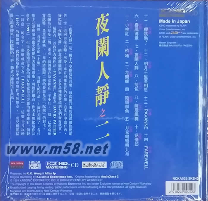 夜闌人靜之二 K2HD(m58.net) 夜闌人靜》是一輯十分受歡迎的音樂,每次補訂來的貨都很快便銷售一空。這會再接再厲,來多十來首同樣性質的音樂,這次有中也有西好把這《夜闌人靜》的意境擴展開來。更多品種讓發燒朋友們好好新。 這里有一首西洋古典作品,PAVANNE,老朋友DAVID PACKER改編為口琴既二胡重奏。這個組合及安排在《辛小紅》二胡已成功地嘗試過,是駕輕就熟,口琴的清脆跟二胡的憂怨是很“配親”的對比。 最后一首是正宗的“土炮”,一首爵士的作品,諸旋律美極了,各位樂手以即興演奏也受旋律的美態所感染,可聽性很高。作者本來想把這作品命名“1997”,但很多聽過這作品的朋友都覺得這美麗的樂章應有一個較“詩意”的名字,那么就命它“FAREWELL”,這么也可反映“1997”的情懷呢。 夜闌人靜是香港資深的發燒錄音師黃啟光先生一手制作而成,是九十年代最受發燒友愛戴的天碟錄音,以最傳真、最靚聲的錄音效果,將二胡、洋琴、笛子、琵琶、中阮、低革胡及敲擊等多種不同類型的中國樂器,一一收錄下來,音色的清晰純厚程度表現極為像真,令中外發燒友贊譽不絕.演奏的曲目全是歷來最經典的中國傳統樂目,首首耳熟能詳,可聽性極高,令人百聽不厭.