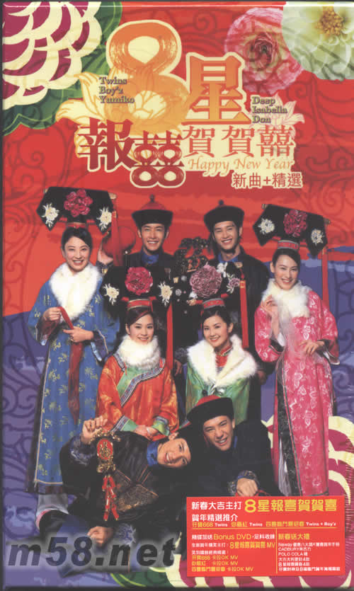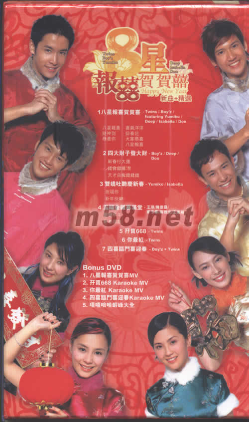 隨碟內(nèi)附送多款歌星利是封及揮春 01. 八星報喜賀賀喜 (新歌) (Twins/Boy'z feat. Yumiko/Deep/Isabella/Don) a. 八星報喜 b. 財神到 c. 恭喜你 d. 喜氣洋洋 e. 迎春花 f. 大家恭喜 g. 八星報喜 02. 四大才子發(fā)大財 (新歌) (Boy'z/Deep/Don) a. 新春行大運 b. 錢會繼續(xù) c. 天才白癡"錢錢錢" 03. 雙驕吐艷慶新春 (新歌) (Yumiko/Isabella) a. 祝福你 b. 新年快樂 04. 五福金雞喜滿堂 (新歌) (王琪/陳偉霆/麥子豪/Mandy/Koey Wong) a. 歡樂年年 b. 新春頌獻 05. 孖寶668 (Twins) 06. 你最紅 (Twins) 07. 四喜臨門喜迎春 (Boy'z) Bonus DVD 01. 八星報喜賀賀喜 MV 02. 孖寶668 Karaoke MV 03. 你最紅 Karaoke MV 04. 四喜臨門喜迎春 Karaoke MV 05. 嘻嘻哈哈哈碌大全