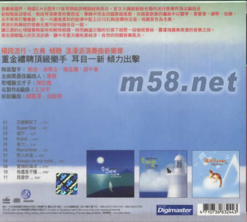 價格為估,以實到貨為準! 我愛你S.H.E歷年暢銷金曲演奏版(貓耳朵音樂繪本3)(m58.net) 樂無國界,精選 S.H.E 歷年 11 首耳熟能詳暢銷經典曲目。首次大膽創新結合國內流行音樂界頂尖編曲,并搜尋網羅全臺北、中、南等間陶笛樂手,如:新銳陶笛家游學成、劉成等演奏家吹奏而成。專輯中完全改編原曲風貌,在饒富創意的編曲中以豎琴、單簧管、鋼琴、弦樂、及木琴等打擊樂器,在一片優美柔和的旋律中配上以 12 孔陶笛獨特活潑、俏麗音色為主奏,將流行與傳統的音樂元素巧妙地融合在一起。讓沉淀的心情隨著陶笛時而輕快悠揚、時而幽遠沉穩的引領下經歷一段愉悅單純、豐富瑰麗無負擔的音樂之旅。拋去煩雜惱人的生活步調,讓今年夏天擁有最純凈、自然的田園音樂風光。 2005年華研再創新流行浪漫風潮“貓耳朵音樂繪本” 演奏曲系列 把旋律還給耳朵 在熟悉的旋律外 聽見最細微的感動 新世紀 減壓音樂 不要負擔 跨廠牌 流行金曲 完整收錄 名樂手 金獎編曲 合力打造 S.H.E 孫燕姿 蔡依林 33首歷年經典名曲全收錄 以陶笛、鋼琴、吉他主奏演奏曲 張張不同 各具風貌 最豪華 33 冠軍曲!! 2005 暑假最 In 發燒強片!貓耳朵音樂繪本 系列一:愛情的城堡 - 蔡依林 1999-2004 歷年暢銷金曲演奏輯 (吉他主奏) 系列二:幸福的綠光 - 孫燕姿 2000-2004 歷年暢銷金曲演奏輯 (鋼琴主奏) 系列三:Remember 我愛你 - S.H.E 歷年暢銷金曲演奏輯 (陶笛主奏)