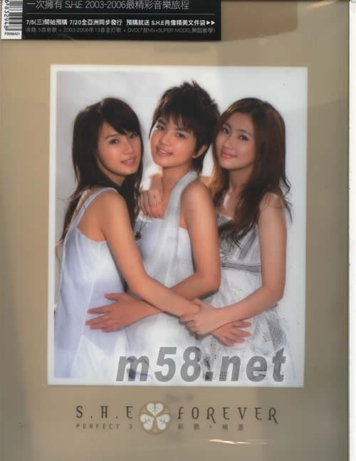 Forever 新歌+精選(7-11版)(m58.net) 斷貨,請停止匯款 預購贈品文件袋尺寸:32.5*24CM 碟尺寸:19*14*1.7CM 華語樂壇最完美女聲天團SHE 2003-2006最精采音樂旅程一次擁有 5首新歌+13首最強主打歌+32頁精美寫真歌詞本+超值DVD(7首MV+SUPER MODEL 舞蹈教學)