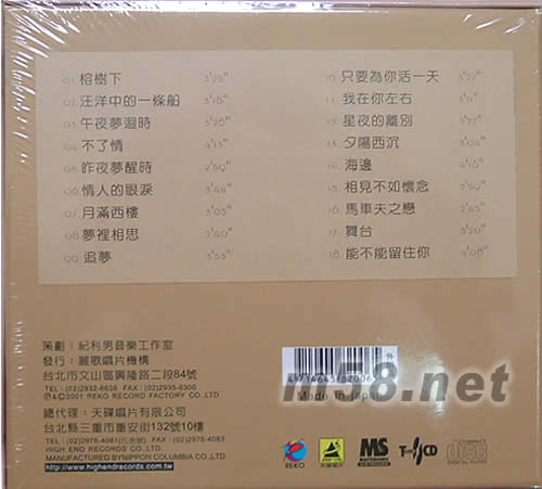 01. 榕樹下 02. 汪洋中的一條船 03. 午夜夢回時 04. 不了情 05. 昨夜夢醒時 06. 情人的眼淚 07. 月滿西樓 08. 夢里相思 09. 追夢 10. 只要為你活一天 11. 我在你左右 12. 星夜的離別 13. 夕陽西沉 14. 海邊 15. 相見不如懷念 16. 馬車夫之戀 17. 舞臺 18. 能不能留住你