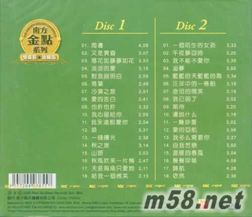 DISC 1 01. 海邊 02. 又是黃昏 03. 落花如夢夢如花 04. 淡淡的愛 05. 對我說明白 06. 落葉 07. 沙漠之旅 08. 愛的告白 09. 也許也許 10. 我心留給你 11. 我永遠都愛你 12. 喚 13. 一線曙光 14. 秋之旅 15. 山路 16. 秋風吹來一片情 17. 天涯海角只愛她 18. 給我一個微笑 DISC 2 01. 一個陌生的女孩 02. 午夜夢回時 03. 我不能不愛你 04. 追夢 05. 藍藍的天藍藍的海 06. 汪洋中的一條船 07. 含淚的微笑 08. 我已明了 09. 期待 10. 還說什么 11. 一聲珍重 12. 愛的回航 13. 我多么需要你 14. 自我苦戀 15. 溫暖的春風 16. 聲聲呼喚 17. 歸航 18. 依然
