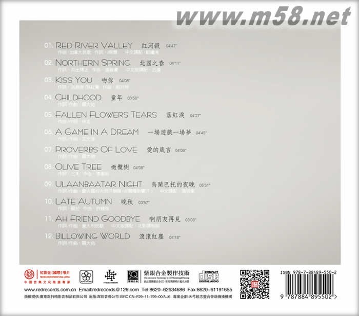 01.紅河谷 Red River Valley 想念心中的故鄉,想你夢中的姑娘,為了生活暫時的離開,你不要傷心不要難過,有你在遠方深情的呼喚我,每一刻都是屬於我的快樂。 02.北國之春 Northern Spring 作於1977年的《北國之春》是一首日本民謠式歌曲,日文原唱歌曲的歌手是千昌夫,歌曲描寫了日本中部地區長野縣一帶的景致,更是對家鄉和親人的萬千思念。 03.吻你 Kiss you 如草原的情深炙熱感人肺腑,如草原的傾訴心聲收放自如,優美中略帶淡淡的哀愁,典雅細膩含蓄的音樂美,匯集成一幅壯美的草原詩畫。 04.童年 Childhood 童年,就像五彩繽紛的夢,醒來還是那樣清晰,讓人回味無窮。童年,就像五彩斑斕的珍珠,串連起無盡的歡樂與稚嫩的夢想。 05.落紅淚 Fallen flowers tears 如果情可以割捨,如果愛可以昇華,為何道別后心還是止不住的難過?為何祝福后淚還是止不住的流淌?獨特的聲線感性而熾熱點滴之間從心底里感動。 06.一場游戲一場夢 A game in a dream 孤單的背影,茫然的情緒,悲苦的愛情,受傷的心靈,感情濃得化不開,背影比誰都孤單,游戲終將是一場夢。 07. 愛的箴言 Proverbs of Love 愛是感天動地,所以才有如此之深刻箴言,愛是刻骨銘心,所以才會如此之佈滿傷痕,愛了就不要后悔,付出更不要沉醉。 08.橄欖樹 Olive tree 流浪的腳步從未歇息停留,從這一邊到那邊的地平線,只是還有天涯孤旅的鄉愁,和漂泊的身影如風的眼眸。 09.烏蘭巴托的夜晚 Ulaanbaatar night 沒有到過烏蘭巴托的人,永遠不知道那里的夜晚是如此動人,凝視頭上高掛的月亮,仿若身在月宮與嫦娥對飲,滿天的星光都在閃爍陪襯。 10.晚秋 Late autumn 風不解,雨綿綿;曲飄然,夜含煙;一個字,幾生緣;夜無言,淚吹散;秋意濃,夢已遠。 11.啊朋友再見 Ah friend goodbye 《啊朋友再見》外文曲名為“ Bella ciao ”,原唱為Yves Montand,是電影《橋》的主題曲,歌曲聲音委婉連綿曲折優美步步高昂,讚頌了革命游擊隊的大無畏的英雄氣概,表現了革命游擊隊視死如歸的精神和品質。 12.滾滾紅塵 Billowing world 率性中透著柔情,回應著一往情深,俯瞰蕓蕓眾生,無盡悲天憫人,耳畔心間世間情懷,滄海桑田過眼云煙。