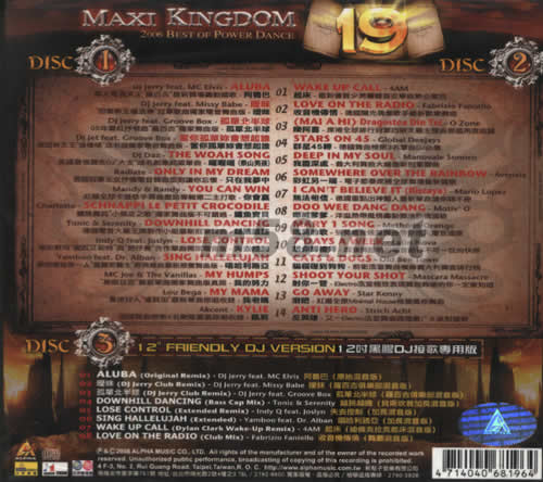 CD1 01 Aluba–DJ Jerry feat. MC Elvis 阿魯巴 - 華人電音天王羅百吉最新舞場轟動國歌 02 曖昧 (DJ Jerry Remix)–DJ Jerry feat. Missy Babe 曖昧 - 甜蜜教主楊丞琳冠軍歌曲獨家電音舞曲版 03 孤單北半球–DJ Jerry feat. Groove Box 孤單北半球-05年最紅抒情曲羅百吉獨家舞曲版 04 當你孤單你會想起誰–DJ Jet feat. Groove Box 當你孤單你會想起誰 - 華語新天王張棟梁成名曲獨家電音舞曲版 05 The Woah Song–DJ Daz 喔喔喔 (泰山男孩) - 英國最強饒舌DJ大支成名創業超級單曲 06 Only In My Dreams–Radiate 只在我夢中 - 德國冠軍玉女抒情電音舞曲甜到讓你忘懷 07 You Can Win–Mandy & Randy 你會贏 - 紅遍全球卡通歌手舞曲童話專輯第二主打歌 08 Schnappi Le Petit Crocodile–Charlotte 鱷魚寶貝 – 鱷魚寶貝小賴皮之歌獨家舞曲版不可錯過 09 Downhill Dancing–Tonic & Serenity 越跳越瞎 – 德國電音大廠王牌制作小組最新冠軍舞曲 10 Lose Control–Indy Q feat. Joslyn 失去控制 - 嘻哈教母蜜西艾莉特與肥仔喬合作單曲獨家電音版 11 Sing Hallelujah–Yamboo feat. Dr. Alban 唱哈利路亞 - 歐陸嘻哈第一人雅爾班醫生經典單曲最新原聲舞曲版 12 My Humps–MC Joe & The Vanillas 我的努力 - 黑眼豆豆最新單曲獨家舞曲版真屌 13 My Mama–Lou Bega 我老媽 - 曼波狂人盧貝加最新單曲原唱收錄 14 Kylie–Akcent 凱莉 - 德國舞曲榜第4名歐陸嚴選原唱收錄 CD 2 01 Wake Up Call–4AM 起床 - 最新優質少男團體首支單曲勢必奪冠 02 Love On The Radio–Fabrizio Faniello 收音機傳情-德國陽光偶像歌手最新歡樂舞曲 03 (Mai A Hi ) Dragostea Din Tei–O Zone 嘜阿喜 –席卷全球排行冠軍四眼天雞主題曲原唱再度收錄 04 Stars On 45–Global Deejays 群星45轉-德國舞曲榜第3名單曲DJ必備 05 Deep In My soul–Manovale Sonoro 我靈深處 - 義大利舞曲大廠最新冠軍舞曲 06 Somewhere Over The Rainbow-Avenzia 彩虹另一端 - 電子節奏席卷全球舞場最新國歌 07 I Can’t Believe It (Biscaya)–Mario Lopez 無法相信-德國重點出神藝人最新單曲讓你嗨不停 08 Doo Wee Dang Dang–Motiv’ O 嘟威爹爹 - 洋溢熱帶風情轟動舞池熱情國歌 09 Mary 1 Song–Methode Orange 瑪莉的歌 - 強勢電音炫風舞曲帶你進入電音國度 10 7 Days A Week–Latin Nova 七天一周 - 超強佛拉明哥電音給你不可一世的快感 11 Cats & Dogs–Old Bee Town 貓貓碰到狗狗 - 前衛浩室舞曲橫掃義大利舞曲排行榜 12 Shoot Your Shot–Mascara Massacre 射你一管 – Electro浩室極致表現舞曲夠嗆的你一定要知道 13 Go Away–Star Kenny 滾吧 – 紅遍全歐Minimal House極簡風格舞曲 14 Anti Hero–Strich Acht 反英雄 – 又一Electro浩室舞曲德國最ㄏㄤ派對國歌 CD 3 附贈滴階專用12吋接歌版本 01 Aluba (Original Remix)-DJ Jerry feat. MC Elvis 阿魯巴 (原始混音版) 02 曖昧 (DJ Jerry Club Remix)–DJ Jerry feat. Missy Babe 曖昧 (羅百吉俱樂部混音版) 03 孤單北半球 (DJ Jerry Club Remix)–DJ Jerry feat. Groove Box 孤單北半球 (羅百吉俱樂部混音版) 04 Downhill Dancing (Bass Cap Mix)–Tonic & Serenity 越跳越瞎 (貝斯坎普加長混音版) 05 Lose Control (Extended Remix)–Indy Q feat. Joslyn 失去控制 (加長混音版) 06 Sing Hallelujah (Extended)–Yamboo feat. Dr. Alban 唱哈利路亞 (加長混音版) 07 Wake Up (Extended Mix)–4AM 起床 (加長混音版) 08 Love On The Radio (Club Mix )–Fabrizio Faniello 收音機傳情 (舞廳混音版)