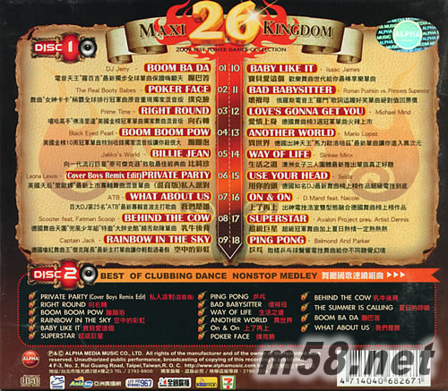 舞曲大帝國 26無敵超強舞霸天碟(m58.net) 舞曲星光 09鉅獻 向"麥可"致敬特別收錄"比莉珍" "羅百吉"最新單曲"蹦巴答" 冠軍曲"撲克臉"、"向右轉"、"蹦蹦泡"、"愛情上身" 超級巨星"里歐娜"、"ATB"、"兜風少年組"、"大胖史酷" 舞曲至尊選集舞曲大帝國26級現身囉! 炎炎夏日最好趴,派對最佳選擇專輯就在這,本專集收錄了兩首舞曲天王"羅百吉"最新作品,英國天后"里歐娜"最新上市專輯里主打單曲"Private Party"混音版,舞曲"女神卡卡"第2支冠軍單曲撲克臉原音重現舞曲混音版,黑人嘻哈歌手美國金榜冠軍曲 "Right Round"獨家舞曲版還有解散后復合的黑眼豆豆美國金榜10周冠軍曲 "Boom Boom Pow"獨家混音版。 蟬連兩屆百大DJ第25名的"ATB"新專輯主打歌曲 What about us也收錄在其中,還有我們當家的舞曲天團"兜風少年組"與嘻哈大老"大胖史酷"合作的"Behind The Cow"也收錄在其中,最佳舞曲陣容都在這張專輯里面,臺灣舞曲唯一霸主!