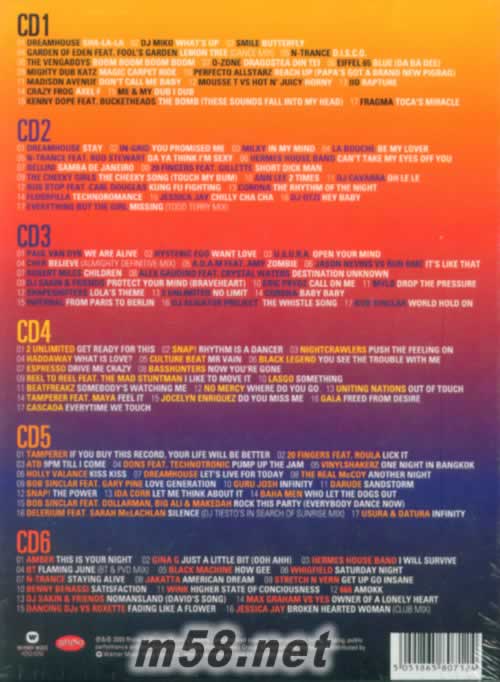 CD 1 01. Sha-La-La - Dreamhouse 02. Whats Up - DJ Miko 03. Butterfly - Smile (not cleared for Taiwan & Philippines) 04. Lemon Tree (Dance Mix) - Garden Of Eden featuring Fool's Garden 05. D.I.S.C.O. - N-Trance 06. Boom Boom Boom Boom - The Vengaboys 07. Dragostea Din Tei - O-Zone 08. Blue (Da Ba Dee) - Eiffel 65 09. Magic Carpet Ride - Mighty Dub Katz 10. Reach Up (Papa's Got A Brand New Pigbag) - Perfecto Allstarz 11. Don't Call Me Baby - Madison Avenue 12. Horny - Mousse T vs Hot N' Juicy 13. Rapture - iio 14. Axel F - Crazy Frog 15. Dub I Dub - Me & My 16. The Bomb (These Sounds Fall Into My Head) – Kenny Dope feat Bucketheads 17. Toca's Miracle - Fragma CD 2 01. Stay - Dreamhouse 02. You Promised Me - In-Grid 03. In My Mind - Milky 04. Be My Lover - La Bouche 05. Da Ya Think I'm Sexy - N-Trance feat Rod Stewart 06. Can't Take My Eyes Off You - Hermes House Band 07. Samba De Janeiro - Bellini 08. Short Dick Man - 20 Fingers feat Gillette 09. The Cheeky Song (Touch My Bum) - The Cheeky Girls 10. 2 Times - Ann Lee 11. Oh Le Le - DJ Cavarra 12. Kung Fu Fighting - Bus Stop feat Carl Douglas 13. The Rhythm Of The Night - Corona 14. Technoromance - Floorfilla 15. Chilly Cha Cha - Jessica Jay 16. Hey Baby - DJ Otzi 17. Missing (Todd Terry Mix) - Everything But The Girl CD 3 01. We Are Alive - Paul van Dyk 02. Want Love - Hysteric Ego 03. Open Your Mind - U.S.U.R.A. 04. Believe (Almighty Definitive Mix) - Cher 05. Zombie - A.D.A.M feat Amy 06. It's Like That - Jason Nevins vs Run DMC 07. Children - Robert Miles 08. Destination Unknown - Alex Gaudino feat Crystal Waters 09. Protect Your Mind (Braveheart) - DJ Sakin & Friends 10. Call On Me - Eric Prydz 11. Drop The Pressure - Mylo 12. Lola's Theme - Shapeshifters 13.No Limit - 2 Unlimited 14. Baby Baby - Corona 15. From Paris To Berlin - Infernal 16. The Whistle Song - DJ Aligator Project 17. World Hold On - Bob Sinclar CD 4 01. Get Ready For This - 2 Unlimited 02. Rhythm Is A Dancer - Snap 03. Push The Feeling On - Nightcrawlers 04. What Is Love? - Haddaway 05. Mr Vain - Culture Beat 06. You See The Trouble With Me - Black Legend 07. Drive Me Crazy - Espresso 08. Now You're Gone - Basshunters 09. I Like To Move It - Reel To Reel featuring the Mad Stuntman 10. Something - Lasgo 11. Somebody's Watching Me - Beatfreakz 12. Where Do You Go - No Mercy 13. Out Of Touch - Uniting Nations 14. Feel It - Tamperer feat Maya 15. Do You Miss Me - Jocelyn Enriquez 16. Freed From Desire - Gala 17. Everytime We Touch - Cascada CD 5 01. If You Buy This Record, Your Life Will Be Better - Tamperer 02. Lick It - 20 Fingers feat Roula 03. 9pm Til I Come - ATB 04. Pump Up The Jam - DONS feat Technotronic 05. One Night In Bangkok - Vinylshakerz 06. Kiss Kiss - Holly Valance 07. Let's Live For Today - Dreamhouse 08. Another Night - The Real McCoy 09. Love Generation - Bob Sinclar feat Gary Pine 10. Infinity - Guru Josh 11. Sandstorm - Darude 12. The Power - Snap! 13. Let Me Think About It - Ida Corr 14. Who Let The Dogs Out - Baha Men 15. Rock This Party (Everybody Dance Now) - Bob Sinclar Feat. Dollarman, Big Ali & Makedah 16. Silence (DJ Tiesto's In Search Of Sunrise Mix) - Delerium feat Sarah McLachlan 17. Infinity - USURA & Datura CD 6 01. This Is Your Night - Amber 02. Just A Little Bit (Ooh Ahh) - Gina G 03. I Will Survive - Hermes House Band 04. Flaming June - BT (BT & PVD Mix) 05. How Gee - Black Machine 06. Saturday Night - Whigfield 07. Staying Alive - N-Trance 08. American Dream - Jakatta 09. Get Up Go Insane - Stretch N Vern 10. Satisfaction - Benny Benassi 11. Higher State Of Conciousness - Wink 12. Amokk - 666 13. Nomansland (David's Song) - DJ Sakin & Friends 14. Owner Of A Lonely Heart - Max Graham vs Yes 15. Fading Like A Flower - Dancing DJs vs Roxette 16. Broken Hearted Woman (Club Mix) - Jessica Jay