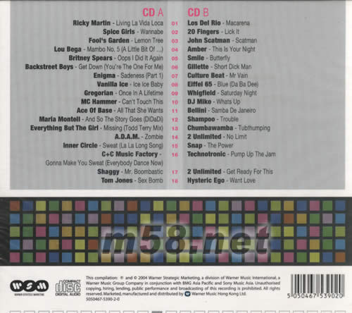 CD A 1、RICKY MARTIN--LIVING LA VIDA LOCA 2、SPICE GIRLS--WANNABE 3、FOOL‘S GARDEN-LEMON TREE 4、LOU BEGA--MAMBO NO,5(A LITTLE BIT OF 、、、) 5、BRITNEY SPEARS--OOPS I DID IT AGAIN 6、BACK STREET BOYS--GET DOWN(YOU’RE THE ONE FOR ME) 7、ENGMA--SADENESS(PART 1) 8、VANILLA ICE--ICE ICE BABY 9、GREGORIAN--ONCE IN A LIFETIME 10、MC HAMMER--CAN‘T TOUCH THIS 11、ACE OF BASE--ALL THAT SHE WANTS 12、MARIA MONTELL---AND SO THE STORY GOES(DIDADI) 13、EVERYTHING BUT THE GIRL--MISSING (TODD TERRY MIX) 14、A,D,A,M--ZOMBIE 15、INNER CIRCLE -SWEAT(LA LA LONG SONG) 16、C+C MUSIC FACTORY--GONNA MAKE YOU SWEAT(EVERYBODY DANCE NOW) 17、SHAGGY--MR,BOOMBASTIC 18、TOM JONES--SEX BOMB CD B 1、LOS DEL RIO--MACARENA 2、20FINGERS--LICD IT 3、JOHN SCATMAN -SCATMAN 4、AMBER--THIS IS YOUR NIGHT 5、SMILE--BUTTERFLY 6、GILLETTE--SHORT DICK MAN 7、CULTURE BEAT--MR VAIN 8、EIFFEL 65--BLUE(DA BA DEE) 9、WHIGFIELD--SATURDAY NIGHT 10、DJ MIKO--WHATS UP 11、BELLINL-SAMBA DE JANEIRO 12、SHAMPOO--TROUBLE 13、CHUMBAWAMBA--TUBTHUMPING 14、2 UNLIMITED--NO LIMIT 15、SNAP--THE POWER 16、TECHNOTRONIC--PUMP UP THE JAM 17、2 UNLIMITED--GET READY FOR THIS 18、HYSTERIC EGO--WANT LOVE