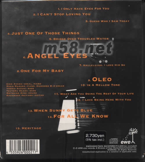 1、I ONLY HAVE EYES FOR YOU 2、I CAN‘T STOP LOVING YOU 3、GUESS WHO I SAW TODAY 4、JUST ONE OF THOSE THINGS 5、BRIDGE OVER TROUBLED WATER 6、ANGEL EYES 7、HALLELUJAN,I LOVE HIM SO 8、ONG FOR MY BABY 9、OLEO 10、IN A MELLOW TONE 11、WHAT ARE YOU DOING THE REST OF YOUR LIFE 12、I LOVE BEING HERE EITH YOU 13、WHEN SUNNY GETS BLUE 14、FOR ALL WE KNOW 15、HERITAGE