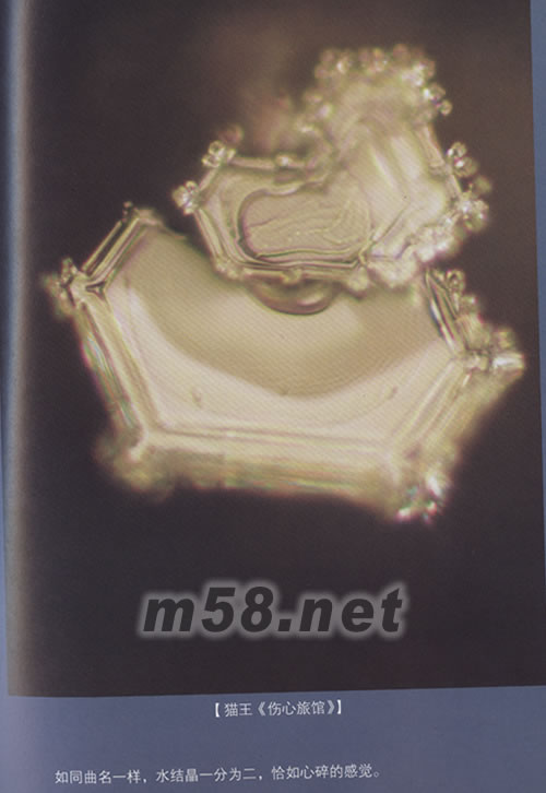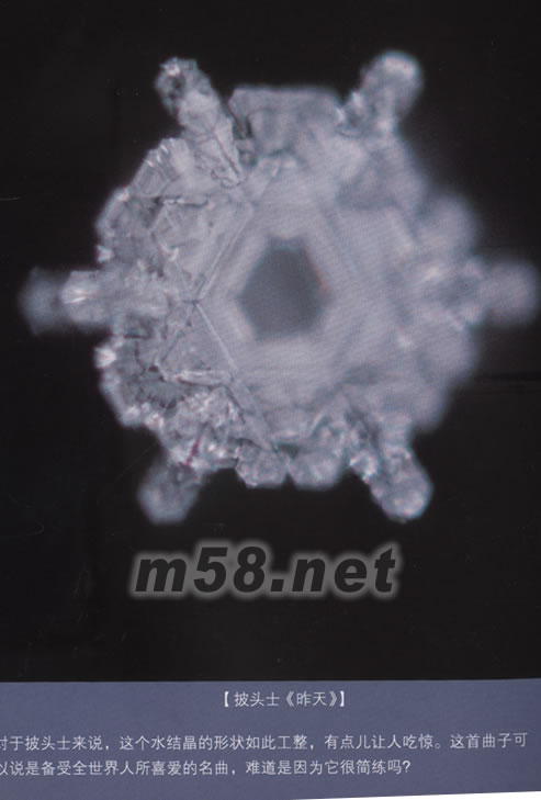 音樂的治療作用已經(jīng)越來越被人們所證實(shí)及推廣。日本科學(xué)家江本勝先生在對水結(jié)晶的研究中發(fā)現(xiàn),水是能聽懂音樂的,聽了不同的音樂,水的結(jié)晶照片會呈現(xiàn)不同的形狀,聽到重金屬搖滾,水是結(jié)不成開頭的混亂狀態(tài),聽到披頭士樂隊(duì)的《昨天》水結(jié)果呈美麗規(guī)則的形狀,聽到貓王的《傷心旅館》水結(jié)晶一分為二,恰如心碎的感覺。水結(jié)晶圖片見掃描圖。 人之所以有靈氣,可能因?yàn)槿松眢w中含有70%的水的緣故吧,能聽懂音樂的,并不只是人類的大腦,還有水份本身。所以,盡量給自己聽優(yōu)美的音樂吧,能讓身心寧靜祥和的。音樂吧會注意推薦類似“BREATH OF JADE宇宙的氣息”之類的治療音樂。