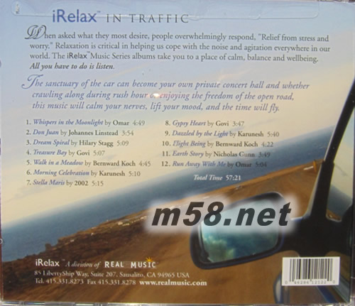 I Relax In Traffic 身心靈抒緩系到第五輯 新世紀純音樂(m58.net) Real Music唱片公司總部設在美國加利福尼亞,由生于倫敦的Terence Yallop在1985年創辦。擁有Karunesh、Kevin Kern等二十多位簽約藝人,發行七十多種專題系列唱片,在美國等四十多個國家的主流和另類樂壇均占有重要地位,它的出品是Billboard雜志的New Age排行榜上的常客,因此在過去的四年中被該雜志評為第二大New Age品牌。在當今經濟不斷發展的社會,無論生活壓力還是工作壓力也都變得緊張起來,而放松減壓是關鍵。 高峰時段的擁堵,在汽車里能夠舒緩你神經的就是iRelax音樂系列,當你聆聽由Real Music于2007年發行的《iRelax: In Traffic》這張由Real Music旗下樂手演奏的12曲柔和音樂作品,你會徹底放松和減輕來自世界各處的噪音煩惱! 這張《iRelax: In Traffic》是減壓專輯的第五張,iRelax是Real Music公司推出的精選輯系列,款款主題不同,這款《iRelax: In Traffic》中的12首曲目可以幫助你舒緩緊張的情緒,使你身心平衡、身體健康。