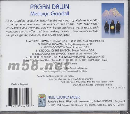 黎明PAGAN DAWN 新世紀純音樂(m58.net) MADE IN ENGLAND 梅得溫發揮得淋漓盡至的特輯 一貫的器樂包括南美排笛、德西馬琴、結他、獸皮鼓、笛以及令人驚人的特別效果混合真實的地方音樂,編排一系列今人鼓舞的節奏,聽得到的自然輕松。