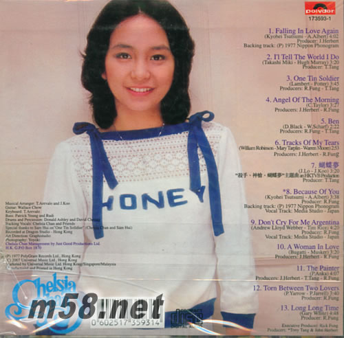 01. Falling In Love Again 02. I'l Tell The World I Do 03. One Tin Soldier 04. Angel Of The Morning 05. Ben 06. Tracks Of My Tears 07. 蝴蝶夢 08. Because Of You 09. Don't Cry For Me Argentina 10. A Woman In Love 11. The Painter 12. Torn Between Two Lovers 13. Long Long Time
