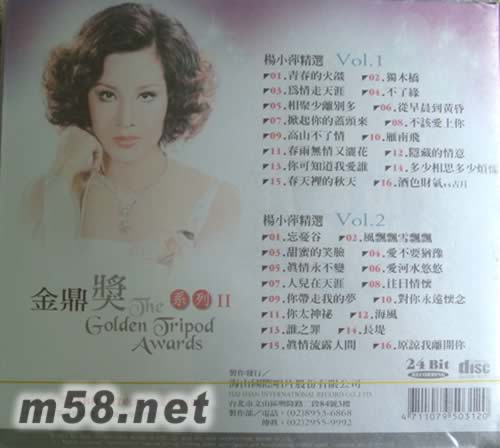 楊小萍精選 Vol.1 01. 青春的火焰 02. 獨木橋 03. 為情走天涯 04. 不了緣 05. 相聚少離別多 06. 從早晨到黃昏 07. 掀起你的蓋頭來 08. 不該愛上你 09. 高山不了情 10. 雁南飛 11. 春雨無情又灑花 12. 隱藏的情意 13. 你可知道我愛誰 14. 多少相思多少煩惱 15. 春天里的秋天 16. 酒色財氣 VS古月 楊小萍精選 Vol.2 01. 忘憂谷 02. 風飄飄雪飄飄 03. 甜蜜的笑臉 04. 愛不要猶豫 05. 真情永不變 06. 愛河水悠悠 07. 人兒在天涯 08. 往日情懷 09. 你帶走我的夢 10. 對你永遠懷念 11. 你太神秘 12. 海風 13. 誰之罪 14. 長堤 15. 真情流露人間 16. 原諒我離開你