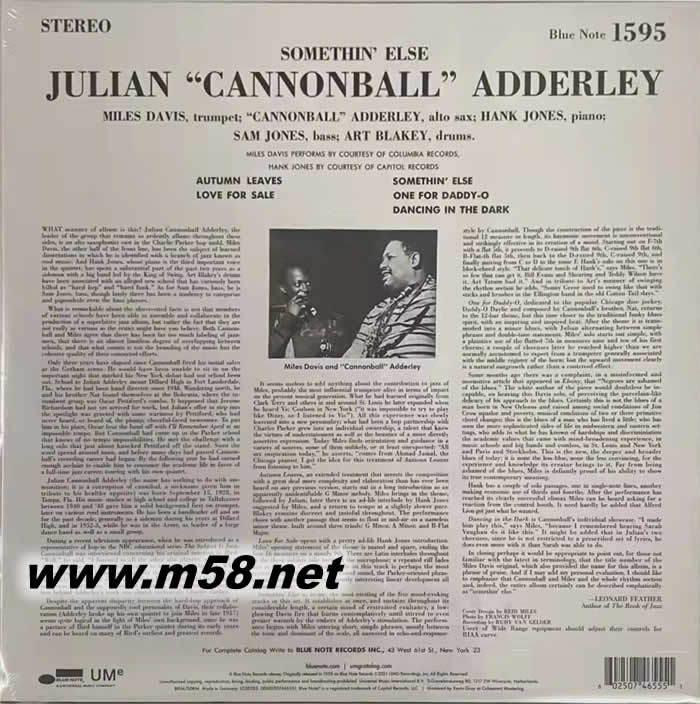 爵士小號手 SOMETHING'S ELSE 黑膠(m58.net) Miles Davis, trumpet 加農炮”·阿德雷《SOMETHING'S ELSE》LP,這是一張極具意義的唱片,爵士音樂史上最偉大的專輯之一。由Miles Davis、阿德雷的銅管二人組搭配創意十足的爵士鼓敲擊,還有優異的鋼琴演奏。唱片中的編曲超越了硬咆哮的視野而扎實的展現出爵士樂之美,《企鵝爵士指南》四星帶花的滿分評價。180克黑膠。