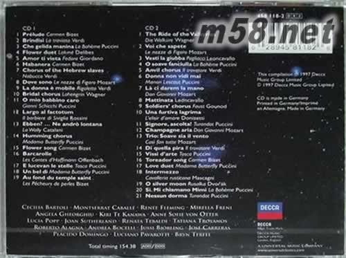 Disc: 1 01 Act 1 Prélude 02 Brindisi: Libiamo, ne' liete calici 03 Che gelida manina 04 Flower Duet: Dôme épais le jasmin 05 Amor ti vieta 06 Habanera: L'amour est un oiseau rebelle 07 Chorus of the Hebrew slaves: Va pensiero 08 Dove sono 09 La donna è mobile 10 Bridal chorus: Treulich geführt ziehet dahin 11 O mio babbino caro 12 Largo al factotum 13 Ebben? .. Ne andrò lontana 14 Humming chorus 15 Flower song: La fleur que tu m'avais jetée 16 Barcarollle: Belle nuit, ô nuit d'amour 17 E lucevan le stelle 18 Un bel di 19 C'est toi .. Au fond du temple saint Disc: 2 01 The Ride of the Valkyries 02 Voi che sapete 03 Recitar! .. Vesti la giubba 04 O soave fanciulla 05 Anvil chorus: Vedi! Le fosche 06 Donna non vidi mai 07 Là ci darem la mano 08 Soldiers' chorus 09 Una furtiva lagrima 10 Signore, ascolta! 11 Champagne aria: Finch'han dal vino 12 Trio: Soave sia il vento 13 Di quella pira 14 Vissi d'arte 15 Toreador song 16 Love duet: Vogliatemi bene 17 Intermezzo 18 O silver moon (Mesícku na nebi hlubokém) 19 Sì Mi chiamano Mimi 20 Nessun dorma