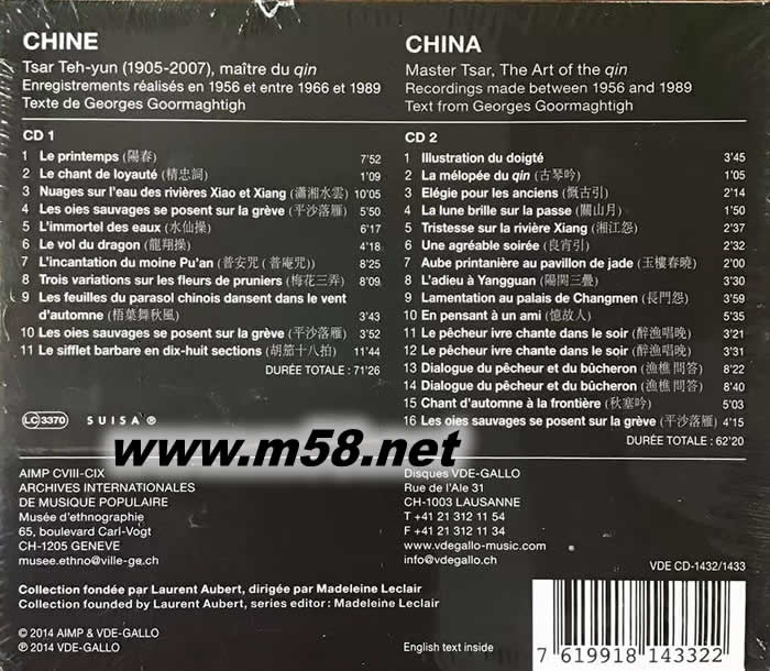 蔡德允(1905~2007) 的古琴藝術(shù)China: The Art of the Qin(m58.net) 古琴泰斗,被譽(yù)為”最后一代中國文人”, 桃李滿香港 [曲目]CD1: 陽春/ 精忠詞/ 瀟湘水云/ 平沙落雁/ 水仙操/ 龍翔操/ 普庵咒/ 梅花三弄/ 梧葉舞秋風(fēng)/ 平沙落雁/ 胡笳十八拍 CD2: 指法演示/ 古琴吟/ 慨古引/ 湘江怨/良宵引/ 玉樓春曉/ 陽關(guān)三曡/ 長門怨/ 憶故人/ 醉漁唱晚/ 漁樵問答/ 秋塞吟/ 平沙落雁