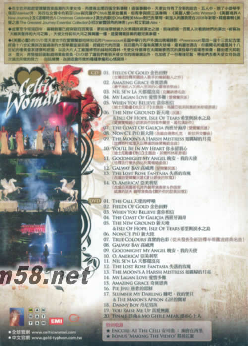 ★CD:全新詮釋動畫《埃及王子》主題曲When You Believe、《泰山》主題曲You`ll Be In My Heart、英國詩人歌手史汀暢銷動人之作Fields Of Gold及改編自德弗札克:新世界交響曲Non C`è Più等14首曲目