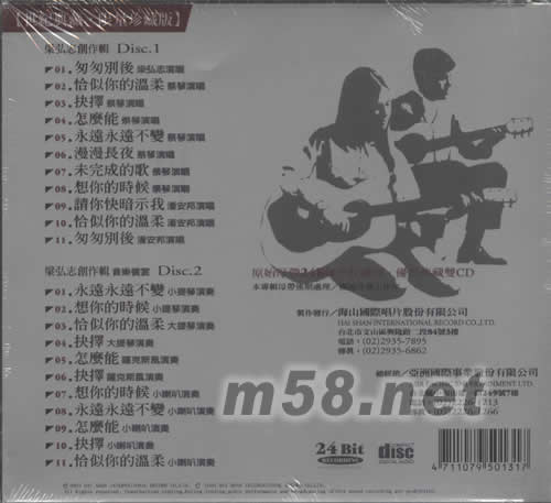 梁弘志創(chuàng)作輯 Disc 1 01. 匆匆別后 -梁弘志演唱 02. 恰似你的溫柔 -蔡琴演唱 03. 抉擇 -蔡琴演唱 04. 怎么能 -蔡琴演唱 05. 永遠(yuǎn)永遠(yuǎn)不變 -蔡琴演唱 06. 漫漫長夜 -蔡琴演唱 07. 未完成的歌 -蔡琴演唱 08. 想你的時(shí)候 -蔡琴演唱 09. 請(qǐng)你快暗示我 -潘安邦演唱 10. 恰似你的溫柔 -潘安邦演唱 11. 匆匆別后 -潘安邦演唱 梁弘志創(chuàng)作輯 音樂饗宴 Disc 2 01. 永遠(yuǎn)永遠(yuǎn)不變 -小提琴演奏 02. 想你的時(shí)候 -小提琴演奏 03. 恰似你的溫柔 -大提琴演奏 04. 抉擇 -大提琴演奏 05. 怎么能 -薩克斯風(fēng)演奏 06. 抉擇 -薩克斯風(fēng)演奏 07. 想你的時(shí)候 -小喇叭演奏 08. 永遠(yuǎn)永遠(yuǎn)不變 -小喇叭演奏 09. 怎么能 -小喇叭演奏 10. 抉擇 -小喇叭演奏 11. 恰似你的溫柔 -小喇叭演奏