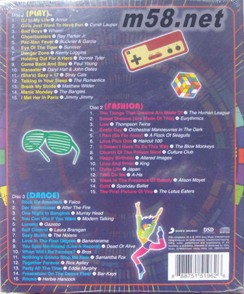 Sony Music 最新英文雜錦3CD,-帶您緬懷及玩盡80年代最精彩時光. 一次過收錄45首原唱流行經典及滄海遺珠. 三張碟呈現不同主題之80年代代表作, DISC1帶您回味好玩之最-歌曲包括絕版單曲罕有再現之Annie及Jimmy Jimmy ; DISC 2重返當年最熱最潮之地, 歌曲包括The Human League, Eurythmics ; DISC3 再次進入年少忘我之懷舊舞池.-Falco,Modern Talking等.
