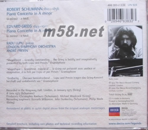 葛利格&舒曼:小調(diào)鋼琴協(xié)奏曲 Grieg/Schumann:Piano Concertos(m58.net) 羅馬尼亞鋼琴家魯普與名指揮普烈文的這套舒曼與葛利格鋼琴協(xié)奏曲唱片,為DECCA歷來最好的鋼琴錄音之一。錄音地點(diǎn)英國(guó)Kingsway廳本就具有優(yōu)異的音響條件,通透的琴韻與飽滿的管弦樂,加上良好的平衡感,構(gòu)成寬松且不局促、不空蕩的聆樂感,早年即已高掛美國(guó)TAS發(fā)燒榜單。魯普具備了一般鋼琴家中少見的大膽創(chuàng)意與細(xì)膩詩(shī)情,其慧眼常能窺見樂曲的深邃內(nèi)涵,舒曼與葛利格的兩首a小調(diào)協(xié)奏曲特有的浪漫性格恒能與魯普的演奏特色相吻合,復(fù)又獲得普烈文與倫敦交響樂團(tuán)以堅(jiān)實(shí)的管弦音色支撐,使本輯錄音突出,演奏亦時(shí)能令人喜出望外