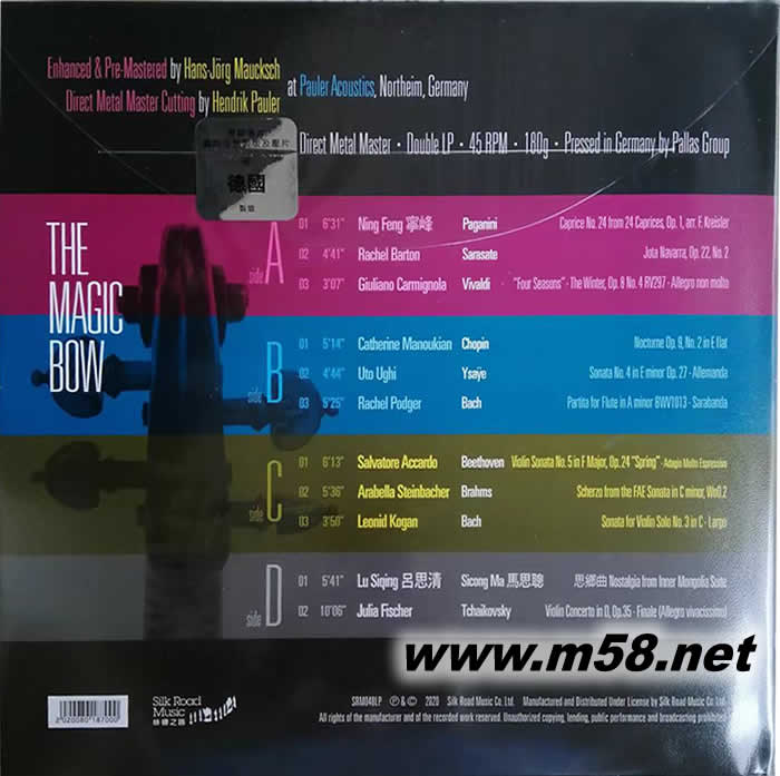 5. 此特輯以180克45轉處女雙黑膠唱片為載體出版,后期製作程序、調教、補足和金屬直刻母盤(Direct Metal Master)製造由「老虎魚」著名工程師漢斯-約爾格.莫斯克斯(Hans-Joerg Maucksch) 負責操刀。精湛的「弓」藝,淬鏈的演奏,顯赫的專業技術,合成一體,將小提琴的音色表現得更為清晰淳厚,明亮透徹,堅韌有勁,線條分明,更能將每一位演奏家的弓法技術細致地展現。示范級的演繹,典藏級的錄音,是鑑賞美樂必然之選。