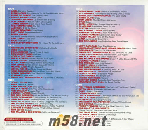 CD1 1.Dancing Queen - Abba / 舞后 – 阿巴合唱團 2.Sorry Seems To Be The Hardest Word – Elton John / 抱歉成為最難啟齒的話語 – 艾爾頓強 3.The Lady In Red - Chris De Burge / 紅衣女郎 - 克里斯迪博 4.Endless Love - Lionel Richie / 無盡的愛 - 萊諾李奇 5.Up Where We Belong - Jennifer Warnes / 飛向我們的歸屬 - 珍妮佛華恩斯 6.I'll Never Fall In Love Again - Tom Jones /我永遠不會再次陷入情網 - 湯姆瓊斯 7.I Got You - James Brown / 我擁有你 - 詹姆士布朗 8.My Girl - The Temptations / 我的女孩 - 誘惑合唱團 9.I'll Be There - Jackson 5 / 我會在你身邊 - Jackson 5 10.Puppy Love - Donny Osmond / 純純的愛 - 唐尼奧斯蒙 11.Tennessee Waltz - Patti Page / 田納西華爾滋 - 佩蒂佩吉 12.Itsy Bitsy Teenie Weenie Yellow Polka Dot Bikini - Brian Hyland / 超迷你黃點比基尼 - 布萊恩海蘭德 13.The End – Earl Grant / 盡頭 – 厄爾葛蘭特 14.I'm Not In Love – 10cc / 我沒有墜入愛河 – 10cc 15.All I Have To Do Is Dream – The Everly Brothers / 只有夢里尋 - 艾佛利兄弟 CD2 1.Unchained Melody - Righteous Brothers / 自由的旋律 - 正義兄弟 2.How Can I Tell Her - Lobo / 我要如何告訴她 - 灰狼羅柏 3.Three Times A Lady - Commodores / 三生三世的戀人 - 海軍準將合唱團 4.Call Me - Dennis De Young / 打給我 - 丹尼斯狄楊 5.Cherish - Kool & The Gang / 珍惜 - 庫爾伙伴合唱團 6.Smoke Gets In Your Eyes - The Platters / 煙霧迷濛了妳的眼 - 五黑寶合唱團 7.Sealed With A Kiss - Brian Hyland / 以吻風箋 - 布萊恩海蘭德 8.Goodbye Yellow Brick Road - Elton John / 再見了黃磚路 - 艾爾頓強 9.Green Green Grass Of Home - Tom Jones / 碧草如茵的家園 - 湯姆瓊斯 10.What’s Going On - Marvin Gaye / 怎么一回事 - 馬文蓋 11.All Night Long - Lionel Richie / 狂歡一整晚 - 萊諾李奇 12.Bridge Over Troubled Water - Nana Mouskouri / 惡水上的大橋 - 娜娜 13.The Twelfth Of Never - Donny Osmond / 天長地久 - 唐尼奧斯蒙 14.I Miss You - Klymaxx / 我想念你 - 克萊麥斯合唱團 15.My World - Engelbert Humperdinck / 這個世界 - 英格伯漢普汀克 CD3 1.Hello - Lionel Richie / 哈羅 - 萊諾李奇 2.Have A Dream – Abba / 世人有夢 - 阿巴合唱團 3.Only Love - Nana Mouskouri / 唯一的愛 - 娜娜 4.Only You - The Platters / 只有你 - 五黑寶合唱團 5.Maggie May - Rod Stewart / 瑪姬 - 洛史都華 6.Stupid Cupid - Connie Francis / 呆呆邱比特 - 康妮法蘭西絲 7.I'd Like To Teach The World To Sing - The New Seekers / 大伙一起唱支歌 - 夢想家合唱團 8.I Only Want To Be With You - Dusty Springfield / 我只想你在身邊 - 達斯汀史普林菲爾德 9.Jambalaya - Hank Williams / 河上的什錦飯 - 漢克威廉斯 10.Doggie In The Window - Patti Page / 櫥窗內的狗 - 佩蒂佩吉 11.Let's Live For Today – The Grass Roots / 活在當下 - 草根合唱團 12.Shake, Rattle And Roll - Bill Haley & His Comets / 搖阿碰阿轉阿 - 比爾哈雷與彗星樂隊 13.Money - Barrett Strong/ 我要的只是錢 - 巴瑞特史特隆 14.Delilah - Tom Jones / 迪來拉 - 湯姆瓊斯 15.California Dreamin’ - The Mamas & The Papas / 加州夢 - 媽媽與爸爸合唱團 CD4 1.What A Wonderful World - Louis Armstrong / 美麗世界 - 路易斯阿姆斯壯 2.Raindrops Keep Falling On My Head - B.J. Thomas / 雨點滴落我頭上 - 比杰湯瑪斯 3.The Last Waltz - Engelbert Humperdinck / 最后華爾滋 - 英格伯漢普汀克 4.Crazy - Patsy Cline / 為愛瘋狂 - 佩西克萊恩 5.The Girl From IpanemaTom Jobim / 伊帕內瑪姑娘 - 湯姆裘賓 6.Babe - Styx / 寶貝 - 冥河合唱團 7.Sad Songs - Elton John / 悲傷的歌 - 艾爾頓強 8.I’ve Never Been To Me - Charlene / 從不屬於我自己 - 夏琳 9.Baby Come Back - Player / 回到我身邊 - 玩家合唱團 10.Stand By Me - Walker Brothers / 常伴左右 - 沃克兄弟 11.Rain And Tears - Aphrodite's Child / 雨和淚 - 愛神之子 12.Lipsitck On Your Collar - Connie Francis / 衣領上的口紅印 - 康妮法蘭西絲 13.King Of The Road - Roger Miller / 公路之王 - 羅杰米勒 14.All Kinds Of Everything - Dana / 所有的所有 - 唐娜 15.You Make Me Feel Brand New - The Stylistics / 是你使我清新 - 學體合唱團 CD5 1.Over The Rainbow - Judy Garland / 彩虹之上 - 茱蒂嘉蘭 2.Moon River - Louis Armstrong And His All Stars / 月河 - 路易斯阿姆斯壯群星會 3.The End Of The World - Brenda Lee / 世界末日 - 布蘭達李 4.Too Beautiful To Last - Engelbert Humperdinck / 留不住的美好 - 英格柏漢普汀克 5.I'll Never Fall In Love Again - Burt Bacharach / 愛情止步 - 伯特巴卡洛克 6.The Great Pretender - The Platters / 偽裝達人 - 五黑寶合唱團 7.Dream A Little Dream Of Me - The Mamas & The Papas / 多夢我一些 - 媽媽與爸爸合唱團 8.Frankie - Connie Francis / 法蘭奇 - 康妮法蘭西絲 9.Love Is All Around - The Troggs / 愛無所不在 - 穴居人合唱團 10.It’s So Easy - Buddy Holly / 愛,如此容易 - 巴弟哈利 11.Guantanamera - The Sandpipers / 關達拉美拉 - 知更鳥樂團 12.A Groovy Kind Of Love - The Mindbenders / 愛最珍貴 - 心靈殺手合唱團 13.Please Mr. Postman - The Marvelettes / 郵差先生請等等 - 奇蹟合唱團 14.My Special Angel - Bobby Helms / 專屬天使 - 巴比賀爾姆斯 15.The Single Girl - Sandy Posey / 單身女子 - 莎迪波斯 16.Tammy - Debbie Reynolds / 黛咪 - 黛比雷諾 17.Tweedle-Dee Tweedle-Dum – Georgia Gibbs / 叮叮噹噹 - 喬琪亞吉布斯 18.As Tears Go By - Marianne Faithfull / 熱淚盈眶 - 瑪莉安菲絲佛 CD6 1.You've Lost That Lovin' Feelin - Righteous Brothers / 相愛的感覺 - 正義兄弟合唱團 2.Philadelphia Freedom - Elton John / 自由費城 - 艾爾頓強 3.I Found Someone - Cher / 遇見另一個人 - 雪兒 4.Easy - Commodores / 輕鬆 - 海軍準將合唱團 5.You Don't Have To Say You Love Me - Dusty Springfield / 不必說愛我 - 達斯汀史