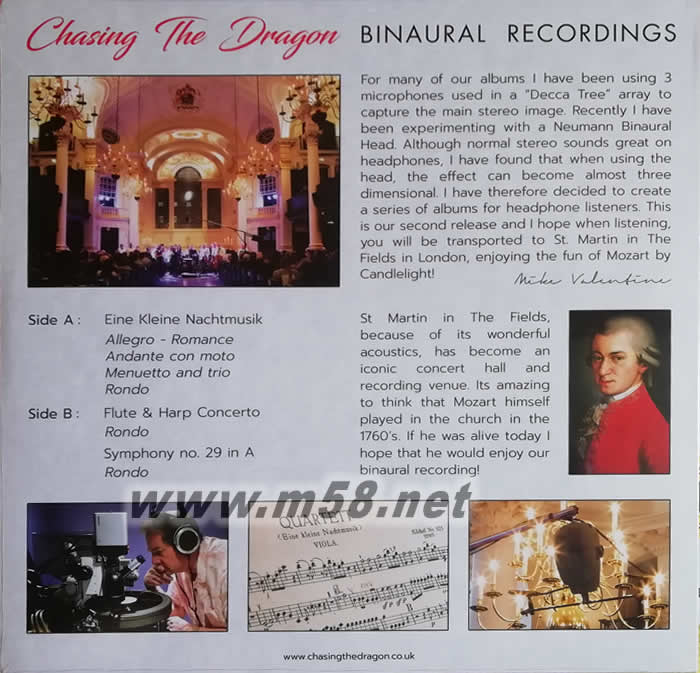耳聽為真 第二集 追龍 Chasing The Dragon – Mozart by Candlelight Binaural Recordings 黑膠(m58.net) Chasing The Dragon追龍第一、第二集,是在英國圣馬田教堂(St. Martin in the Fields)錄音,地利。發燒咪動用了由著名收音咪品牌Neumann公司出品Binaural Head錄音方式,同步收錄當時的音訊,這入耳式錄音方式(又名人頭錄音),是將兩只靈敏度高的Neumann收音咪收藏在一個模擬人頭的耳窩里,目的是反映現場耳朵所接收的聲音及一切之聲效,這是最真實的聲音效果,器利。如此一來,即時可獲得如在現場收聽一樣的感受,真實得可怕。 莫札特長笛與豎琴協奏曲,愛爾蘭豎琴家Jean Kelly及長笛名家Fiona Kelly合作演出,兩姊妹合作天衣無繨,整座教堂美麗音效立體呈現,左手邊是小提琴手,右手邊是低音琴手伴奏,那樣真實的感覺,就好像返回1760年!莫扎特活了!