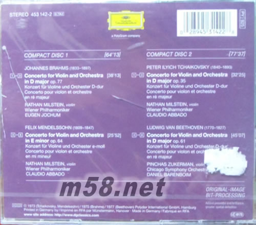 1. Allegro non troppo - Cadenza: Nathan Milstein [21:04] Johannes Brahms (1833-1897), Composer / Nathan Milstein, Violin / Wiener Philharmoniker, Orchestra / Eugen Jochum, Conductor 2. Adagio [9:01] 3. Allegro giocoso, ma non troppo vivace - Poco più presto [8:08] Violin Concerto in E minor, Op.64 1. Allegro molto appassionato [11:38] Felix Mendelssohn (1809-1847), Composer / Nathan Milstein, Violin / Wiener Philharmoniker, Orchestra / Claudio Abbado, Conductor 2. Andante [7:43] 3. Allegro non troppo - Allegro molto vivace [6:29] Violin Concerto in D, Op.35 1. Allegro moderato [17:10] Peter Ilyich Tchaikovsky (1840-1893), Composer 2. Canzonetta (Andante) [6:14] 3. Finale (Allegro vivacissimo) [9:00] Violin Concerto in D, Op.61 Cadenza: Fritz Kreisler 1. Allegro ma non troppo - Cadenza: Fritz Kreisler [25:05] Ludwig van Beethoven (1770-1827), Composer / Pinchas Zukerman, Violin / Chicago Symphony Orchestra, Orchestra / Daniel Barenboim, Conductor 2. Larghetto [10:17] 3. Rondo. Allegro - Cadenza: Fritz Kreisler [9:44]