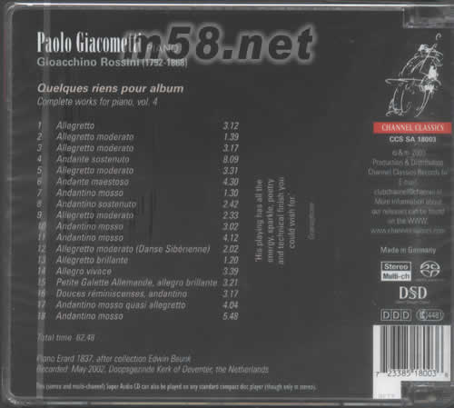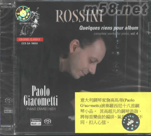 價格為估,以實到貨為準! 羅西尼鋼琴VOL 4 SACD(m58.net) 意大利鋼琴家PAOLO GIACOMETTI演奏羅西尼十八首鋼琴小品。其高超凡的鋼琴造詣,將每首樂曲于編排、氣氛與別不同,扣人心弦。