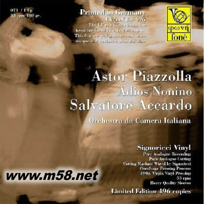 阿卡多與 意大利室樂團(tuán) 皮亞佐拉的探戈作品選Orchestra da Camera Italiana 黑膠 限量版(m58.net) 出生於阿根廷的探戈天王皮亞佐拉(Astor Piazzolla)雙親是意大利人,他的童年時(shí)代在美國紐約渡過,他在這里學(xué)習(xí)到西班牙文、法文及意大利文,這文化背景影響他后來在文化藝術(shù)的創(chuàng)作致深。另一探戈天王加戴爾(Carlos Gardel)對他十分賞識,視他為音樂天才。皮亞佐拉於1953因作曲比賽中得獎(jiǎng),其中一項(xiàng)獎(jiǎng)品是到巴黎深造,他跟隨當(dāng)時(shí)法國最著名作曲家布朗熱(Nadia Boulanger)學(xué)習(xí)作曲,自此便改變他的余生。探戈舞及其音樂是阿根廷的文化圖像,皮亞佐拉曾創(chuàng)作不少同類音樂但並未能如他在歐美等地得到的重視,但自他於1992年過身之后,他的音樂才得國人日漸的認(rèn)同。意大利小提琴一代宗師阿卡多(Salvatore Accardo)擁有超然的樂壇地位,出神入化的琴技往往令人聽得熱血沸騰渾身充滿動(dòng)感,仿如人琴合一般的演奏絕對無人能及,技術(shù)銳不可擋。阿卡多配合"意大利室樂團(tuán)(Orchestra da Camera Italiana)"於2001年5月一個(gè)不經(jīng)刪剪的現(xiàn)場實(shí)況錄音,帶來皮亞佐拉的精選作品包括[再見,諾尼諾(Adios Nonino)]、[布宜諾斯艾利斯的夏天(Verano Porteno)]、[圣母頌(Tanti Anni Prima)]及[給卡瑪拉樂團(tuán)的三首作品(Tres Piezas Para Orcuesta De Camera)],現(xiàn)以33 1/3轉(zhuǎn),180克,以處女膠單一階段式壓片(one-stage pressing)的黑膠盤為載體呈獻(xiàn),后期全在德國製造,全球限量496套,極之珍貴