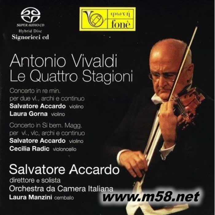 阿卡多 - 維瓦爾第:四季 Four Seasons SACD(m58.net) Salvatore Accardo (小提琴) Laura Manzini (鋼琴) Orchestra da Camera Italiana 意大利小提琴一代宗師阿卡多(Salvatore Accardo)擁有超然的樂壇地位,出神入化的琴技往往令人聽得熱血沸騰渾身充滿動感,仿如人琴合一般的演奏絕對無人能及,技術(shù)銳不可擋。17-18世紀(jì)叱吒古典樂界的風(fēng)云人物之一的維瓦爾第(Antonio Vivaldi)出身自音樂世家,自小跟隨父親學(xué)習(xí)小提琴,是巴洛克鼎盛時期意大利著名的作曲家、小提琴家和音樂教育家,而首本名曲[四季(The Four Seasons)]更瘋魔全球同時亦奠定他在國際樂壇上的崇高地位及影響力,亦被譽(yù)為”協(xié)奏曲之父”。縱然市面上已有很多不同的[四季]錄音版本,但這次由意大利極負(fù)盛名的發(fā)燒品牌<豐力(Fone)>著名錄音師里奇(Giulio Cesare Ricci)親自監(jiān)製,由阿卡多伙拍"意大利室樂團(tuán)(Orchestra da Camera Italiana)"與及杜西馬琴(羽管鍵琴)演奏家羅娜.曼仙妮(Laura Manzini)帶來前所未有、最完美無瑕的版本。另外阿卡多更分別配合小提琴演奏家羅娜.古納(Laura Gorna)、大提琴演奏家塞絲妮亞.拉迪維奇(Cecilia Radic)將[為雙小提琴與通奏低音而作的小協(xié)奏曲F I 第100號(Concerto in re min. per due violini, archi e continuo F I n° 100)] 和 [為雙小提琴與通奏低音而作的小協(xié)奏曲F IV第2號(Concerto in Si bem. Magg. per violino, violoncello, archi e continuo F IV n° 2)],名家們使出渾身解數(shù),加上高超錄音技巧,音效無可比擬,絕對是發(fā)燒樂迷的必備之盤!