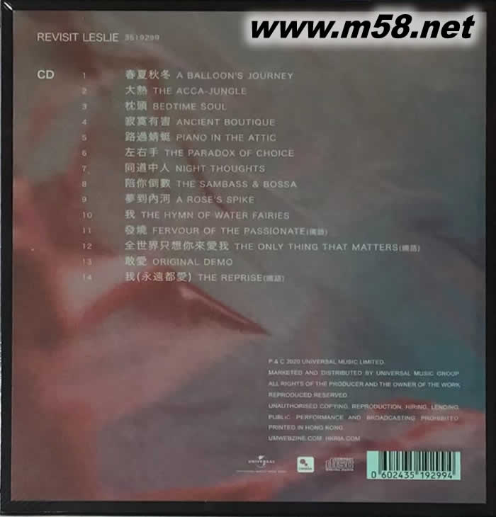 1. 春夏秋冬A Balloon's Journey 2. 大熱 The Acca-Jungle 3. 枕頭 Bedtime Soul 4. 寂寞有害 Ancient Boutique 5. 路過蜻蜓 Piano in the Attic 6. 左右手 The Paradox of Choice 7. 同道中人 Night Thoughts 8. 陪你倒數(shù) The Sambass & Bossa 9. 夢到內(nèi)河 A Rose's Spike 10. 我 The Hymn of Water Fairies 11. 發(fā)燒 Fervour of the Passionate [國語] 12. 全世界只想你來愛我 The Only Thing That Matters [國語] 13. 敢愛 Original Demo 14. 我(永遠(yuǎn)都愛) The Reprise [國語]