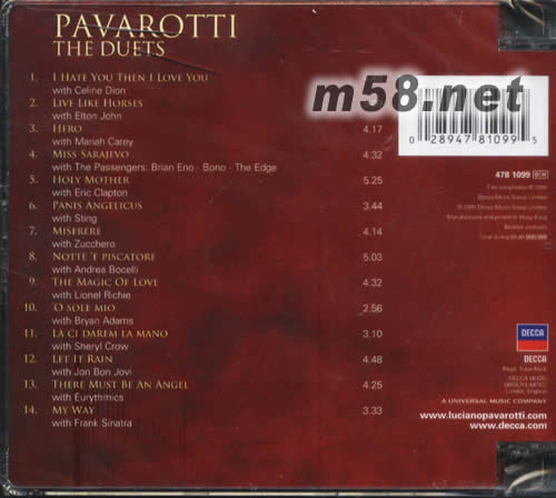 01 I Hate You Then I Love You [with Celine Dion] 02 Live Like Horses [with Elton John] 03 Hero [with Mariah Carey] 04 Miss Sarajevo [with Bono/The Edge/Brian Eno] 05 Holy Mother [with Eric Clapton] 06 Panis Angelicus [with Sting] 07 Miserere [with Zucchero] 08 Notte ’e piscatore [with Andrea Bocelli] 09 The Magic of Love [with Lionel Richie] 10 ’O sole mio [with Bryan Adams] 11 La ci darem la mano [with Sheryl Crow] 12 Let it Rain [with Bon Jovi] 13 There Must be an Angel [with Eurythmics] 14 My Way [with Frank Sinatra]