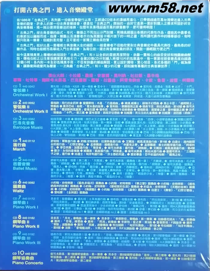 古典之門 II Gate to Classics I I (10CD套裝)(m58.net) 自1986年「古典之門」系列第一份錄音帶發(fā)行以來(lái),又經(jīng)過(guò)CD版本的濃縮再進(jìn)化,已帶領(lǐng)超過(guò)百萬(wàn)臺(tái)灣樂(lè)迷進(jìn)入古典音樂(lè)的殿堂。許多人的第一份古典音樂(lè)錄音,便是從「古典之門」開(kāi)始的。由於它是第一套針對(duì)國(guó)人之需求所設(shè)計(jì)的古典音樂(lè)專輯,甫一推出便深受樂(lè)迷的推崇。從歷年來(lái)累積超過(guò)百萬(wàn)的銷售數(shù)字,便可獲得明證! 「古典之門」按古典音樂(lè)的曲式、年代、樂(lè)器之不同加以分門別類,再精挑細(xì)選出各類的代表性作品,選錄其中最著名的章節(jié)加以編輯而成,指揮、樂(lè)團(tuán)以及演奏者亦均為英國(guó)笛卡唱片旗下的一時(shí)之選。而所謂代表作中的精華部份,有時(shí)雖只取某一樂(lè)章,但絕對(duì)是完整,且可當(dāng)成一首獨(dú)立樂(lè)曲來(lái)欣賞。 「古典之門」就好比是一套權(quán)威古典音樂(lè)大全的縮影,一般愛(ài)樂(lè)者不但能欣賞到古典音樂(lè)史中最具代表性、最熟悉的好聽(tīng)作品,同時(shí)也能輕而易舉地入門古典音樂(lè),為每位欲一窺古典音樂(lè)堂奧的朋友,開(kāi)啟一扇輕鬆方便之門。 如今這套精美更上層樓的新版設(shè)計(jì)「古典之門」I和II以全新的面貌再度問(wèn)世,承襲一貫精心的曲目安排和精闢樂(lè)曲解說(shuō),價(jià)格也較之以往單張購(gòu)買更具吸引力。全套20張CD分別編入兩個(gè)10片的包裝盒中,每一單套收錄音樂(lè)長(zhǎng)度均超過(guò)12個(gè)小時(shí),各內(nèi)附一本全彩色精美手冊(cè),不但有詳盡的樂(lè)曲解說(shuō),更以設(shè)計(jì)獨(dú)特、賞心悅目、各式各樣的「門」做為插圖,讓聽(tīng)覺(jué)與視覺(jué)同為饗宴。一次典藏「古典之門」I和II,極少的花費(fèi),即刻擁有專屬的古典音樂(lè)世界!
