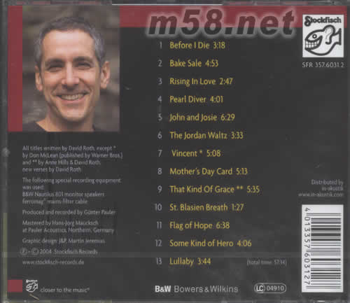 PEARL DIVER 智慧潛水員(m58.net) David Roth《Pearl Diver》專輯,這是一張讓人足以震撼心靈的大碟,在超級(jí)錄音棚中,用性感、清澈、感情豐富、穩(wěn)重等諸多形容詞來形容David Roth的嗓音絲毫都不嫌多,而且這種感覺讓人能很直接的感覺到,就在你聽到這首曲子的一瞬間。這首曲子配樂簡(jiǎn)單,以鄉(xiāng)村吉他為主線勾勒背景。精良的錄音,一流的唱工,讓這首曲子適合作為男聲測(cè)試曲,你應(yīng)該感受到一位成熟、溫和的David Roth。