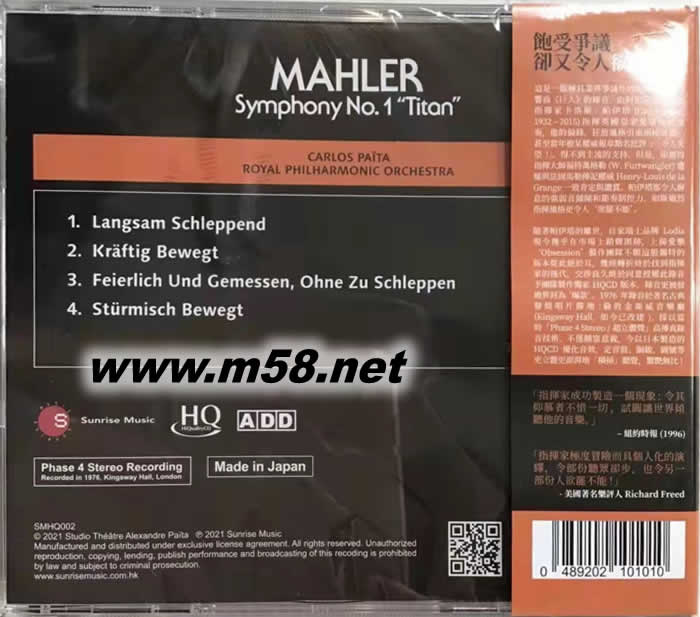 Mahler: Symphony No.1 馬勒: 第一號交響曲《巨人》 HQCD(m58.net) 極具爭議性的錄音版本 著名古典發燒唱片勝地: 倫敦金斯威 (Kingsway Hall) 音樂廳 「Phase 4 /超立體聲」錄音技術錄音 日本Memory-Tech株式會社高規格製版HQCD 卡洛斯•帕伊塔 (Carlos Païta)/ 指揮 英國皇家愛樂 指揮大師福特萬格勒(W. Furtwangler) 遺孀與法國馬勒傳記權威 Henry-Louis de la Grange 一致肯定與讚賞 「指揮家成功製造一個現象: 令其仰慕者不惜一切,試圖讓世界傾聽他的音樂。」– 紐約時報 (1996) 「指揮家極度冒險而具個人化的演繹,令部份聽眾卻步,也令另一部份人欲罷不能!」 - 美國著名樂評人Richard Freed