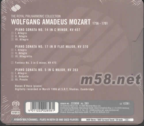 PIANO SONATA NO.14 IN C MINOR,KV 457 1 I.Allegro 2 II.Adagio 3 III.Allegro PIANO SONATA NO.17 IN B FLAT MAJOR ,KV 570 4 I.Allegro 5 II.Adagio 6 III.Allegretto 7 Fantasy No.3 in C minor,kv 475 PIANO SONATA NO.5 IN G MAJOR,KV 283 8 I.Allegro 9 II.Andante 10 III.Presto Ronan O'Hora(piano) Digitally recorded in March 1996 at S.R.T.Studios,cambridge