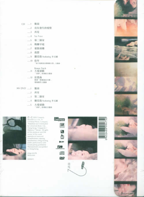CD 01. 脆弱 02. 沒有發(fā)生的愛情 03. 再見 04. So Free 05. 第二個(gè)家 06. 晚睡早起 07. 愛情預(yù)購(gòu) 08. 我想 09. 蘭花指 (featuring李玉剛) 10. 拾年 (“第十屆華語音樂傳媒大獎(jiǎng)”主題曲) Bonus Track: 11. 大愛感動(dòng) (“同伊”香港版主題曲) 12. 狂想曲 (豐澤“想像就是力量”電視廣告主題曲) DVD Music Videos 01. 脆弱 02. 再見 03. 第二個(gè)家 04. 蘭花指 (featuring李玉剛) 05. 大愛感動(dòng) (“同伊”香港版主題曲)