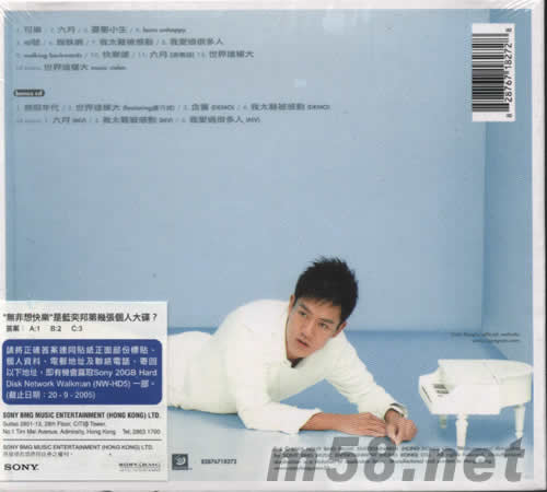 價格為估,以實到貨為準! 無非想快樂 (加重份量版)(m58.net) 雙CD包括全新派臺歌曲“無瑕年代”及3首MUSIC VIDEOS。 “無非想快樂”是藍奕邦第幾張個人大碟? 答案:A:1 B:2 C:3 請將正確答案連同貼紙正面部分標貼、個人資料、電地址及聊絡電話,寄回以下地址,即有機會贏取 Sony 20GB Hard Disk Network Walkman(NW-HD5) 一部。(截止日期:20-9-2005) 04年實力唱作新人藍奕邦第二張個人原創CD《無非想快樂》,今次他再次一人包辦曲、詞、彈、唱,并將大碟致送給尋找快樂的人!第一版推出至今被受歡迎,為謝支持現特別推出「加重份量版」,Bonus Disc額外輯錄精彩影音Extra ,包括AUDIO版本的「含蓄」、「我太難被感動」Demo,以及與CANDY合唱的「世界這樣大」版本,還有三首新曲MV。 繼「熱帶魚」后,另一感性歌曲「六月」迅速成為今期熱播主打。藍奕邦本來改此曲名為「六月飛霜」,因為歌詞描述自己生于這悲情世代,雖然很多不如意發生,人們也要積極面對人生,因此他改此曲為「六月」。 其它推薦歌曲包括「我太難被感動」、「世界這樣大」及「可樂」。CD extra收錄了「世界這樣大」MV。
