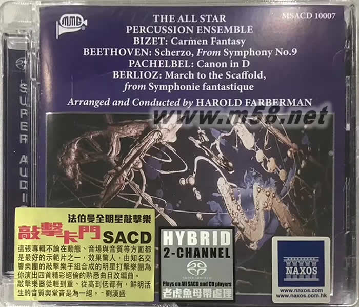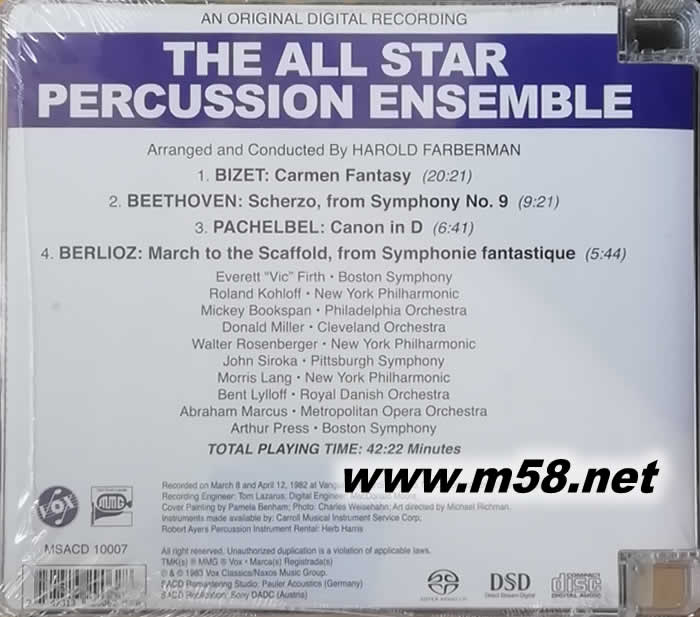 The All Star Percussion Ensemble 敲擊卡門 SACD(m58.net) 敲擊卡門 SACD版 原裝VOX-MMG母盤,由老虎魚重新母帶處理 All Star Persussion Ensemble - Harold Farberman 敲擊卡門 - 法伯曼全明星敲擊樂 這張SACD不論在動態(tài)、音場與音質(zhì)等方面都是最好的示范片之一,效果驚人,由知名交響樂團(tuán)的敲擊樂手組合成的明星敲擊樂團(tuán)為你演出四首精彩絕倫的熟悉曲目改編曲。 敲擊樂器從輕到重、從高到低都有,鮮明活生的音質(zhì)與堂音是為一絕。